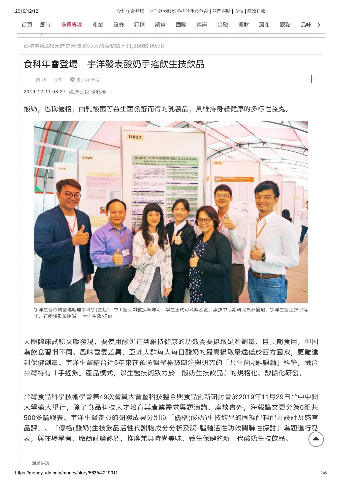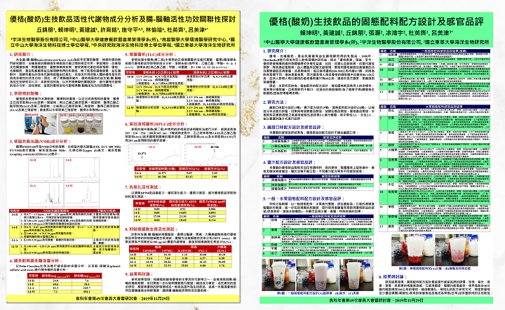 台灣食品科學技術學會第49次會員大會暨科技整合與食品創新研討會於2019年11月29日台中中興大學盛大舉行,除了食品科技人才培育與產業需求專題演講、座談會外,海報論文更分為6組共500多篇發表。宇洋生醫參與的研發成果分別以「優格(酸奶)生技飲品的固態配料配方設計及感官品評」、「優格(酸奶)生技飲品活性代謝物成分分析及腸-腦軸活性功效關聯性探討」為題進行發表,與在場學者、廠商討論熱烈,推廣兼具時尚美味、養生保健的新一代酸奶生技飲品。