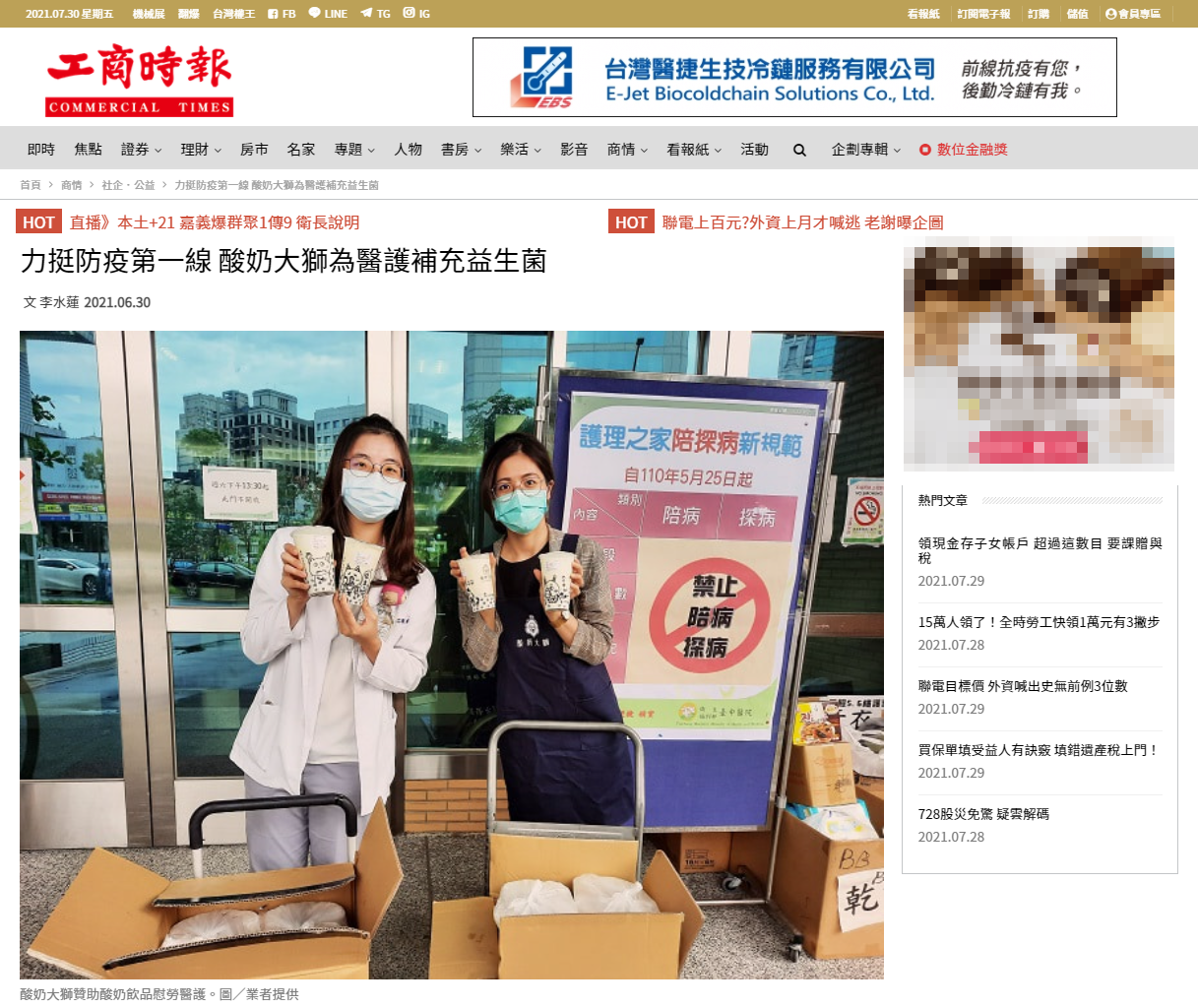 工商時報報導-力挺防疫第一線 酸奶大獅為醫護補充益生菌